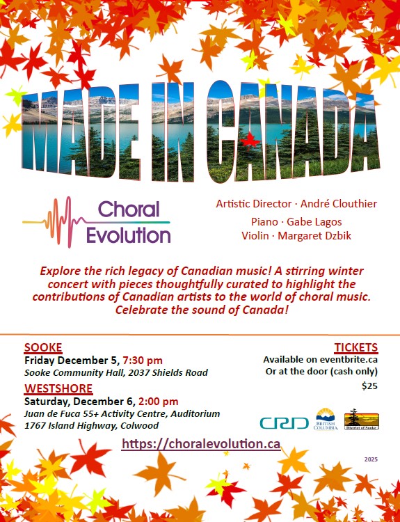 Experience the beauty and breadth of Canada’s musical landscape in this inspiring winter concert – celebrate the composers, poets and songwriters who have shaped our nation’s choral voice. Featuring works by Gordon Lightfoot, Stan Rogers, and leading contemporary Canadian composers, along with a selection of seasonal songs, this program captures the warmth, depth, and vitality of our country’s musical spirit.