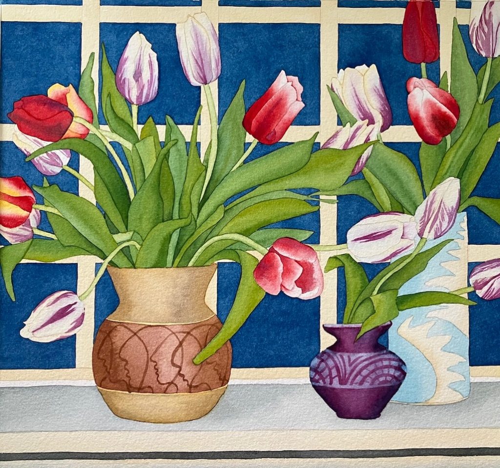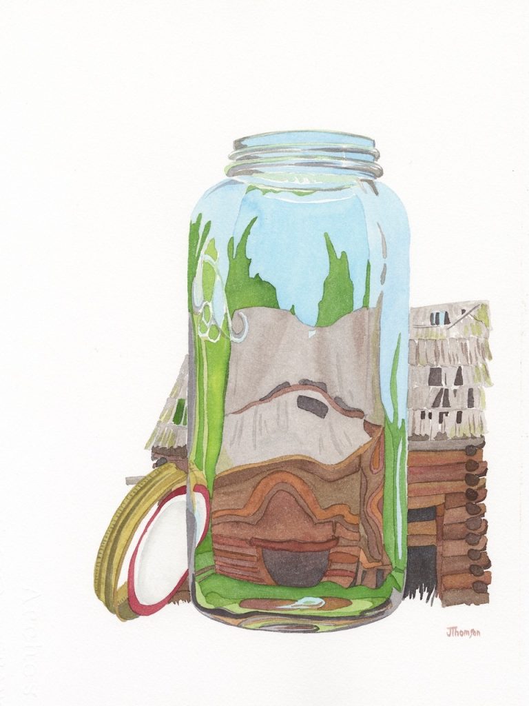 Artist Statement: Vessels are such a useful metaphor for embedding meaning beyond the literal. And they are beautiful. Sometimes the literal meaning is more than enough. Three series are featured in this exhibition. The oldest one is the Bottled Series which began as the ‘bottled women series’ and expanded to include people of all genders. It is an exploration of oppression, internalized and externally applied. These colourful, abstract works were dominant in Thomson’s creative life for over twenty years. The second series is the 300 Mason Jar Series. The majority of these paintings were created between 2014 and 2019. It is a family history comprised of 276 paintings on paper (13 of which will be in this exhibition). The jars contain artifacts that hold memories and secrets with the lids are off to let the secrets out. 300 Mason Jars: Preserving History was published by Heritage House as a full colour book in the fall of 2024. The third series of vessels are vases. These works are vacations. Simply an opportunity to spend time with the beauty that they are and that they hold. No hidden meanings. Purely contemplation of the beauty available in our world.